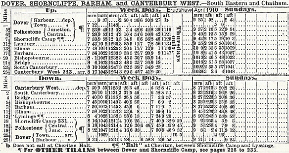 The first timetable shows daily trains in each direction between Shorncliffe Camp and Barham, with three on Sundays. First, second and third class accommodation was available.