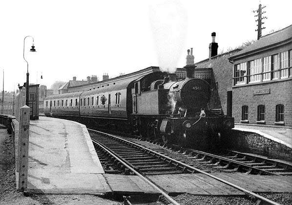 ![]() Station Name: BRIDPORT![]() Bridport station looking south-west in April 1958. An 0-6-0 tank prepares to take a two-coach passenger train to Maiden Newton. Note the signal box at the north end of the up platform and the gas lamps mounted on BR Southern Region style supports.