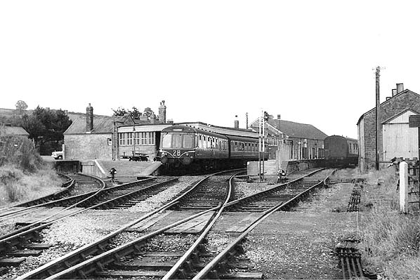 ![]() Station Name: BRIDPORT![]() A general view of Bridport station, looking north in August 1963. The down platform has been stripped of its structures but the up platform, where the 2-car DMU is standing, retains its buildings, and the station is still staffed. The engine shed is to the right, and the goods depot is in the background.