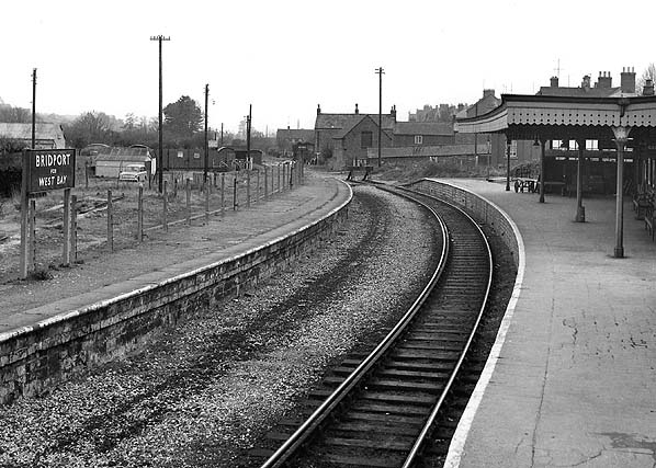 ![]() Station Name: BRIDPORT![]() Bridport station looking south from the down platform c.late 1969, shortly before the station became unstaffed. The inspection pit from the demolished engine shed can be seen to the right of