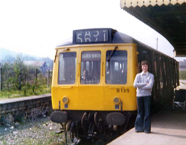 The photographer (Gerry Andrews) poses beside the DMU at Bridport station in 1974.