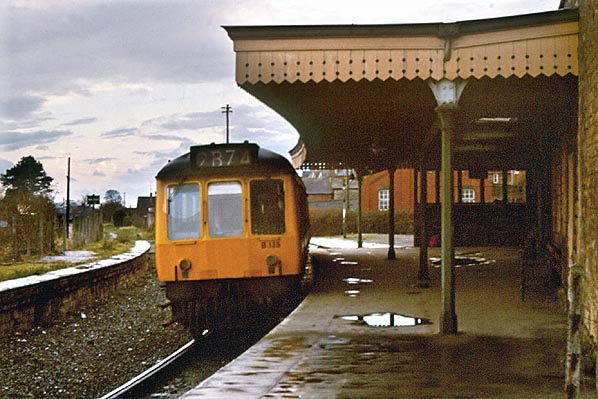 A single-car DMU waits on the deserted up platform at Bridport station in March 1974.