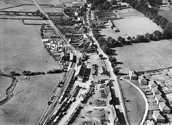![]() Station Name: BRIDPORT![]() An aerial view looking south over Bridport station in September 1928. The goods depot, to the right of the passenger station, the engine shed (left) and the track layout are clearly seen. Awnings provide shelter on both of the platforms..