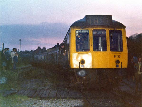 The penultimate train prepares to depart for Maiden Newton on on 3 May 1975, the last day of public service. A 4-car DMU was provided on the last day to cater for the expected crowds.