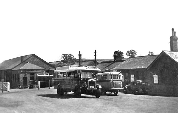 ![]() Station Name: BRIDPORT![]() The modest exterior of Bridport station c1930s, looking north-east. The two buses and motor car in the forecourt add period interest. The goods office is seen at the end of the goods shed on the left.