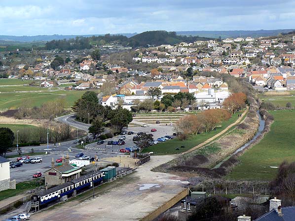 ![]() Station Name: BRIDPORT WEST BAY![]() In this aerial view of April 2008, looking northwards, West Bay station is in the left foreground. The station building has been renovated sympathetically, and a short stretch of track reinstated to accommodate two coaches. At this time the station was still a restaurant but within four months the restaurant had closed and the coaches had gone. The trackbed of the former railway continues northwards as a footpath. West Bay is now attached to Bridport by continuous urban development. Photo by Phil Stovell ![]()