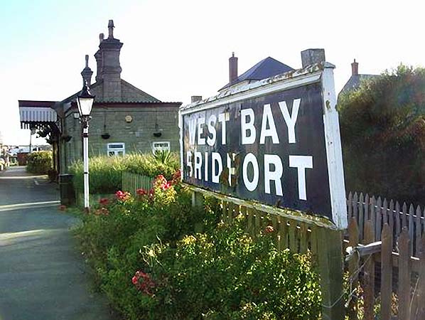 Bridport West Bay station sign in August 2006. The poor condition of the enamel signs suggest it could be an original.