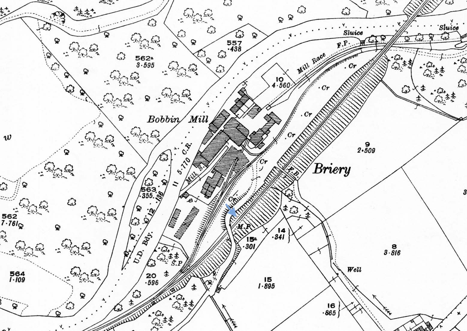 1924 1: 2,500 OS map. Briery Siding Halt was not shown on Ordnance Survey maps. The platform was immediately north-east of the bridge carrying the road to the Bobbin Mill (named) on the up (north-west) side of the track. The layout of the mill sidings, installed in the 1890s, is clearly represented. The River Greta forms the north-western boundary of the mill. The Mill Race diverting water from the river upstream to provide power to the mill and the Mill Stream which returns water to the river are both identified on the map