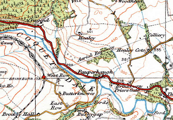 There was a single goods siding on the up side serving a loading bay, this faced towards Rothbury and could only be used by down trains. The station served Healey Coate Colliery and was linked to it by a two mile aerial ropeway.