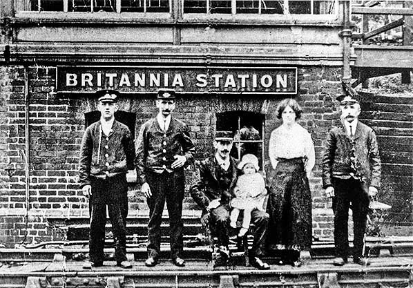 Britannia Station Gallery 1: Early 20th Century - 1959 ![]() Only the signal box at Britannia appears to have been photographed before the station closed in 1917. Its position is about 50yd west of the station, on the up side of the tracks. Commenting on this photograph, Jeffrey Wells (1993) suggests that it dates from World War 1, and he draws attention to the severed arm of the man on the left as well as to the confidence of the party that no train is due since they are standing and seated on the up line. It would be interesting to know the identity of the four railwaymen, the woman and the child.