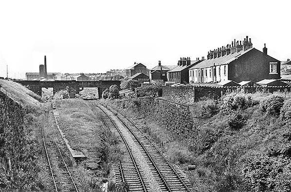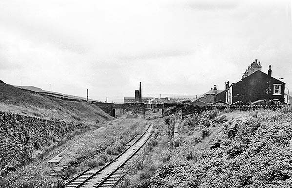 Looking east from the north bridge on the lane to Walmsley across the site of Britannia station towards Old Lane bridge on 17 August 1961. The station closed to passengers in April 1917; it never handled goods traffic. The broad island platform was originally sheltered by a large awning, and the booking office was at road level, immediately right of the camera. However, these buildings were demolished during the LMS era (1923-47). The flagstones of the platform are overgrown and its up (left) side is degraded owing to the removal of the edge stones. Both the old up line and the loop that pass below the bridge are seen, but vegetation conceals the old down line to the right of the platform. Although disused since 1952 the rails have been left in place in case needed for wagon storage. The substantial retaining walls were necessary as the shale and glacial clays are prone to slippage. The two terraces to the left of the photo are on Rochdale Road