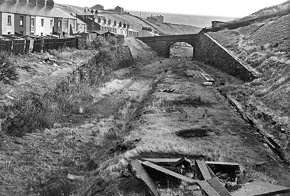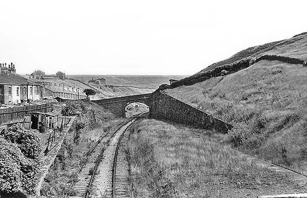 The single island platform at Britannia is seen in 1956, looking east. The station closed in 1917. Part of the stone staircase leading down from the bridge is still in place. By this time the railway track on the right (the original down line) has been abandoned, and the up line on the opposite face of the platform has been reclassified as the down line, its neighbouring loop becoming the up line. The headshunt and connection with the new up line can be seen beneath the bridge beyond the platform. The edge stones have been removed adjacent to the new up line in case they were to fall onto the track from the derelict platform. Officially both of the tracks to the left have been closed since 1952, but for a further 11 years they would be retained in case they were needed for wagon storage.