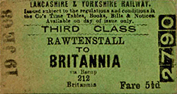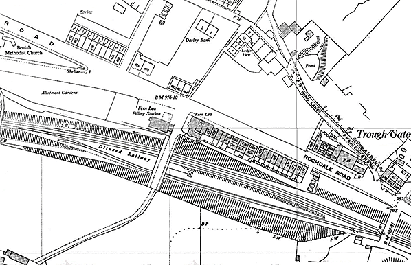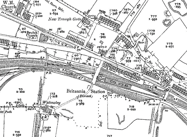 1910 1: 2,500 OS map. Uniquely among the intermediate stations on the Facit Branch, Britannia had an island platform. The booking hall is shown east of the road overbridge, and the shaded area includes the staircase (covered?) down to the platform and the awning which extended about half the length of the platform is shown by pecked lines. The small buildings beneath the awning are also marked. Sidings are located to the west on the down side (south of the running lines) and a standard gauge tramway extends southwards off the map to serve some small coal pits and the Britannia Quarries. The signal box is identified between the two overbridges west of the platform. Some of the neighbouring terraces are shown to be ‘back-to-back’, including the cluster on Market Street close to the bridge at the east end of Britannia station. The road south of Beulah Chapel is called ‘New Line’, referring to the adjacent railway: it was ‘new’ in comparison to the Irwell Valley route to Bacup and the Rochdale-Facit section. The village of Britannia, named after an inn, includes scattered terraces and two Methodist churches. Unless they were employed in the mills, many of the men of the village will have trekked uphill to work in the quarries or pits each day. In the year after this map was published a street tramway, connecting Rochdale and Bacup, was opened and it followed Market Street immediately north of Britannia station. Click here for a larger version.