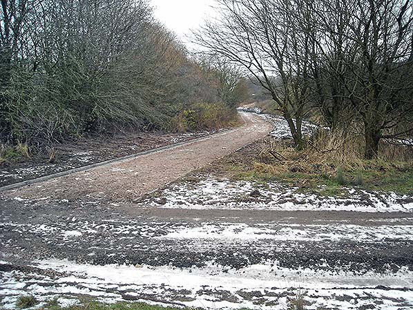 Looking east from the former bridge at Britannia in January 2016 the viewpoint is similar to John Mann’s view of September 1971 above. The cutting has been filled in, the remains of Britannia station have been buried and for some years a path has followed the line of the railway.