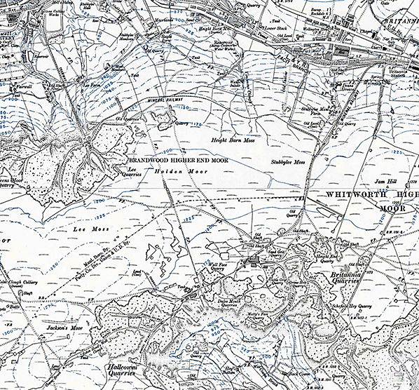 1912 1:10,560 OS map. By the early twentieth century the moors south and west of Britannia were extensively quarried for flagstones which were removed via the various mineral railways. Britannia station is in the north-east corner of this map extract, and the steeply inclined mineral railway which carried the stone from the moorland quarries is seen striking south-westwards from the station. On the moor top there are numerous individually-named quarries, collectively known as Britannia Quarries, and a number of abandoned coal workings (some identified as ‘Old Shaft’). A branch from the line connecting Britannia station and quarries follows a near-level route to Lee Quarries, from which a steeply-graded tramway leads down to a point between Stacksteads and Bacup in the Irwell valley. After being moribund for many years the quarries on the tops are now active again, but the railways have long gone. Click here for a larger version