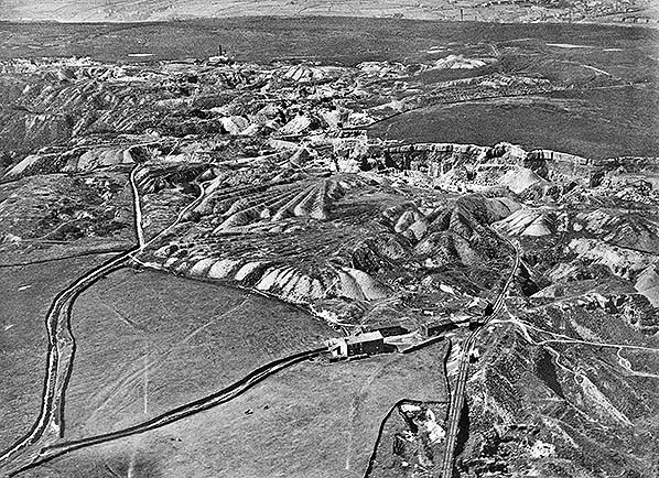 ![]() An oblique aerial photograph from August 1926 of the Facit and Britannia quarries on the moor top west of the Facit Branch. North-west is at the top of the photograph. A mineral line is seen entering the photo at the bottom, whilst the line connecting the quarries to Britannia station is visible as the dark line curving, then running straight to leave the image below the top right corner.