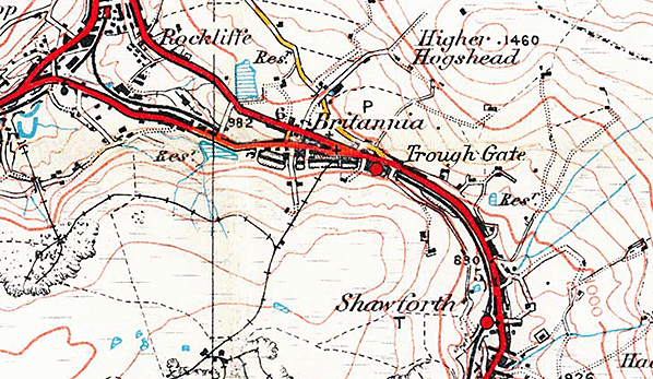 1960 1: 2,500 OS map. The survey probably dates from the mid 1950s. The railway is now shown to be disused and sidings have been removed. Britannia station’s platform is shown but the northern (up) face has lost its edge stones as a slope is shown rather than a crisp edge: photo evidence confirms that this had happened. A fragment of the staircase is the only other structure surviving at the station. On the moors beyond this map extract to the west and south some quarries have now closed and are being used for disposal of refuse. Click here for a larger version.