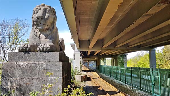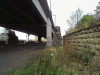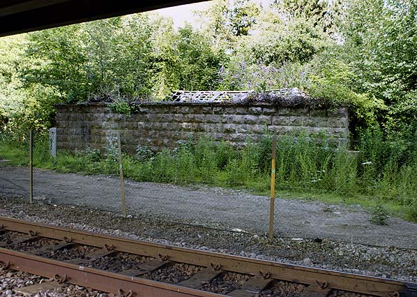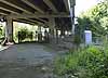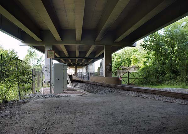 having just come off the bridge. Photo by Berriff3 ![]() Looking west at the site of Britannia Bridge station in July 2011. The structure above the station site is the road deck of the Britannia Bridge. On the evening of the 23rd of May 1970 some boys who were playing on the structure dropped a burning torch which set light to the tar coated roof of the tubes. The bridge was severely damaged the tubes themselves were beyond saving. The bridge was closed until the 30th of January 1972 when one line was re-opened. It was then substantially altered and a road deck was installed above the railway. The road deck which carried the A55 opened in 1980.