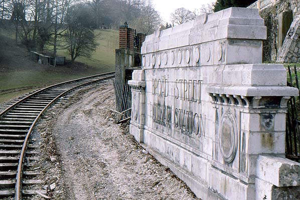 This engraved stone from the front of Broad Street Station is now on display at Fawley Hill railway museum near Henley on Thames. (April 1986)