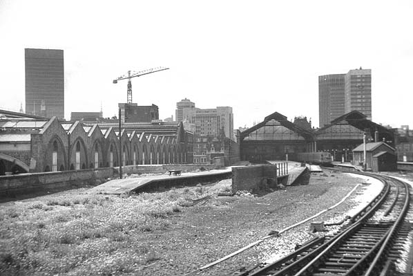 Broad Street Station in 1975 with the abandoned Poplar line platforms on the left Photo by Ted Burgess