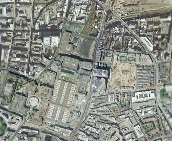 Aerial view of the Broad Street Station site (now Broadgate Complex) in 2005. The arena on the left hand side is on the site of the goods depot.