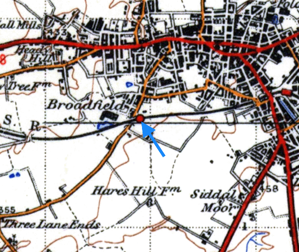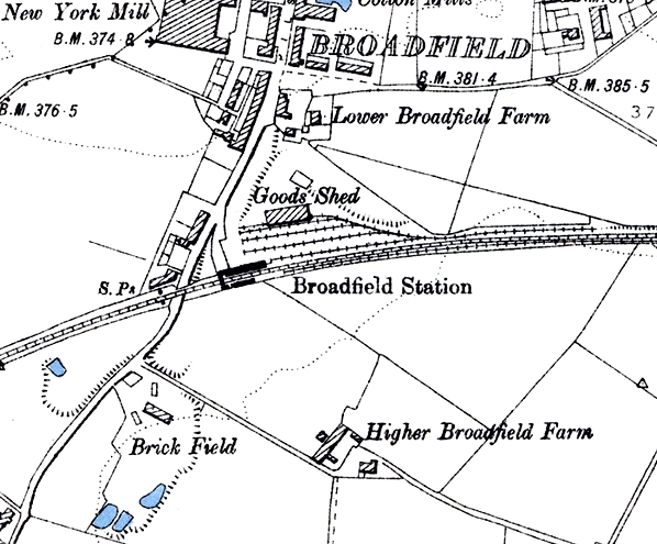 Broadfield station was on the southern edge of the settlement after which it was named and on the east side of Pilsworth Road which passed under the line. It was a mile west of Heywood station and three miles to the east of Bury. The locality was a manufacturing district and the large New York Mill was just to the north of the station.