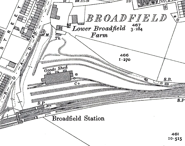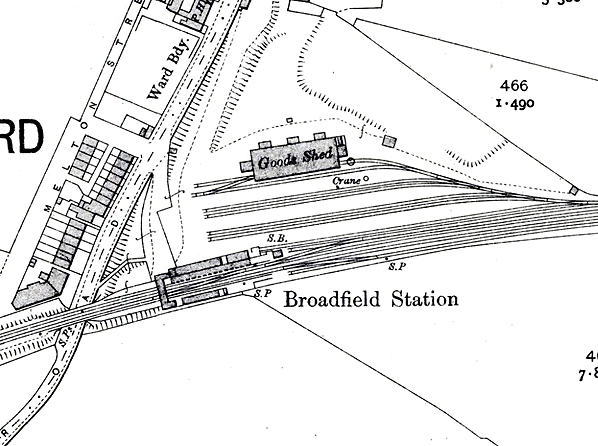 The 1904 Railway Clearing House Handbook of Stations listed Broadfield as able to handle general goods and parcels; it was equipped with a 10-ton lifting crane.