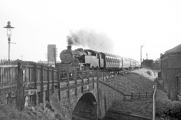 ![]() A Bolton to Rochdale service crosses the Pilsworth Road bridge on 6 July 1959. The western end of Broadfield’s up platform can be seen to the left.
