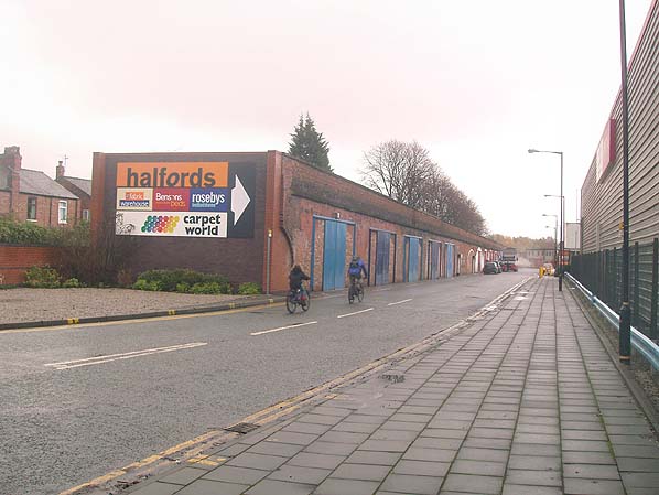 The approach to Broadheath Station from the east. The viaduct carried the line over the A56 to the station.