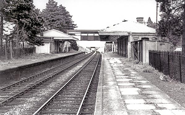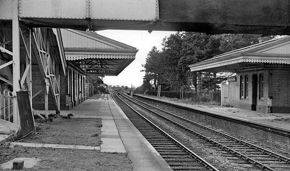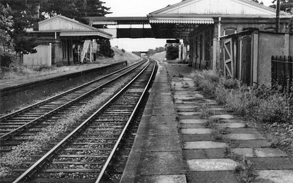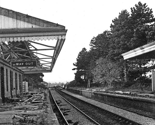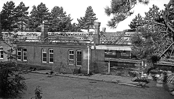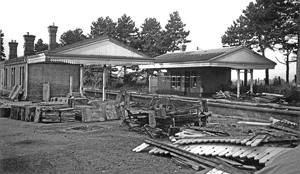 Looking south-west along the platform during demolition in November 1963. The slabs have already been removed. The station building is still there, but the awning has lost its roof. The platform 2 running-in board has gone, but the waiting room and gents' are still there; the signal box has also gone. The goods shed is just visible in the distance, the only original part of the station complex to survive today.