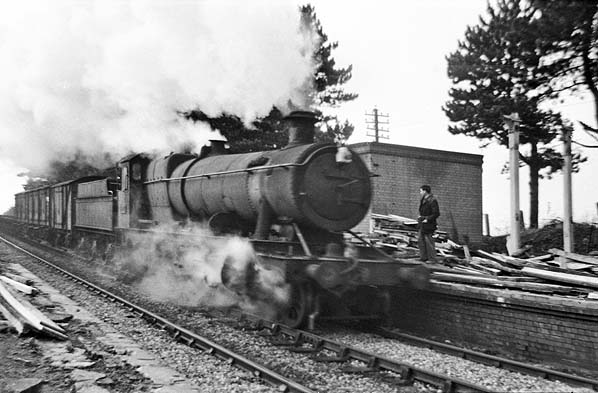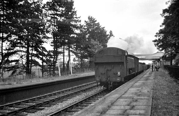 9453 has trundled through Broadway station with a freight from the Honeybourne direction in July 1962. The station by this time is disused, although the goods yard is still open, and this indeed is the next stopping point of this train. The 'Broadway' sign behind the train has been removed following the closure of the station to passengers, but the cast iron posts remain in situ. The construction of the platform is evident in this picture. This southern part was on made-up ground and, while the earth was fresh, the new platforms were made of wood. At a later date concrete foundations were cast, and the platform extension built of blue engineering bricks, as in the photograph. The edge of the platform was made of 3ft and 4ft heavy concrete slabs, with thinner slabs behind, and gravel behind them. A GWR spear head fence closed off the rear.
