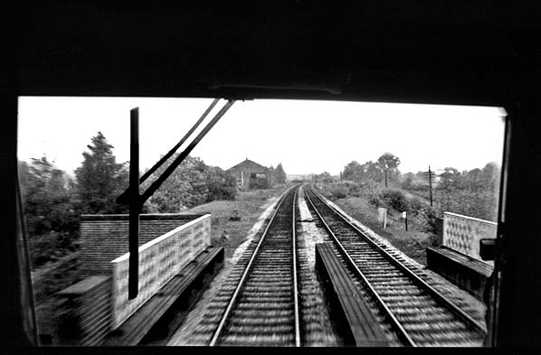 Broadway goods shed looking south from the rear cab of D1749 in May 1969, with the Evesham Road bridge in the foreground. The signal box that used to stand behind the wall on the left has gone, but the LH track is newly ballasted. The capstones on the road bridge are missing, but the guard rails are still brightly painted in light grey. Photographer Brian Parsons' notes for the day show that they had left Worcester with D1749 and had been to Ashchurch, back to Worcester, Long Marston, then finally to Toddington where they picked up 18 wagons for Worcester.