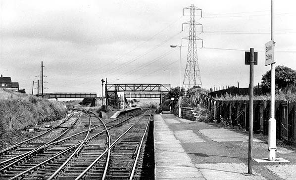 ![]() Looking east from the down (Newcastle-bound) platform of Boldon Colliery station in the mid 1970s. The station building formerly stood in the foreground to the right, but it was demolished shortly after the station ceased to be staffed. The footbridge at the end of this platform connects to the other for trains to Sunderland. The lines curving away to the left lead to Green Lane Junction, Tyne Dock and South Shields; the route was briefly used by passenger trains in the 1830s-40s, but they have carried only goods and mineral traffic for over a century.