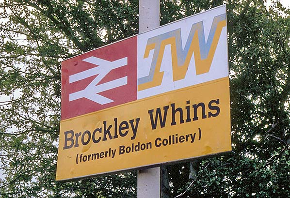 ![]() In August 1992 a nameplate at Brockley Whins advises passengers of the recent change of name; the sign is using the Tyne & Wear Metro Calvert font on that system’s ‘Newcastle Cadmium Yellow’ background., even though it would be a decade before Metro trains began to call here. The joint interests of British Rail and Tyne & Wear local authorities in the station are shown