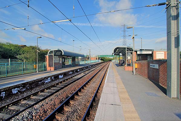 ![]() Looking east at Brockley Whins station in May 2013. In preparation for its transfer to Metro operation the up platform was rebuilt to the west to face the down platform.