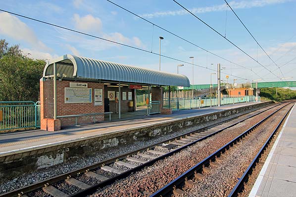 The shelter on the up platform of Brockley Whins Metro station, looking north-east in May 2013.