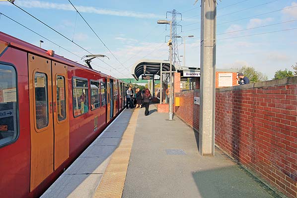 A Metro train at the down platform of Brockley Whins in May 2013. The livery of the car sides contrasts with the ‘traditional’ yellow of the cabs.