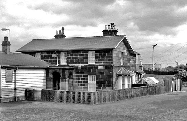 ![]() The eastern elevation of the main building at Boldon Colliery on 20 September 1970. The station has been unstaffed for almost a year, and the building is in residential use. The awkward placing of the timber shed so close to the porch spoils the dignity of the station building. The bay window, a hallmark of the work of architect G T Andrews, will be noted.