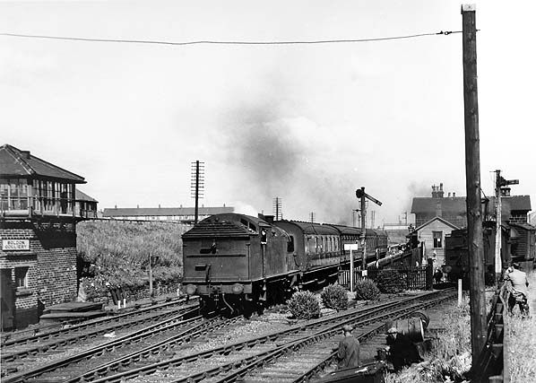 ![]() An ex-North Eastern Railway T2 0-8-0 locomotive of a type introduced in 1913 (LNER/BR Q6) hauls a train of empty mineral hopper wagons past Boldon Colliery station (seen to the left) heading in the direction of Tyne Dock. A member of the class survives in working order. Note the group of youthful admirers standing alongside the fence to the right of the picture.