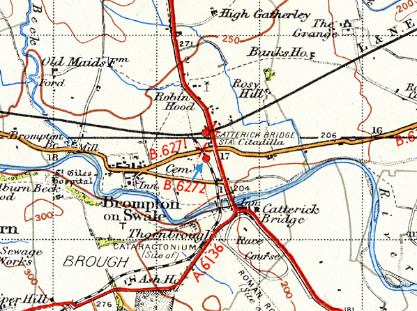 Notes: Brompton Road was the eastern terminus of the Catterick Military railway. It was used by the push-and-pull shuttle service running from Catterick Camp to connect with trains on the Richmond branch. Passengers travelling on to Darlington and beyond would leave the train at Brompton Road and walk the short distance to Catterick Bridge where they could catch a regular public train from Richmond. The shuttle service was used by soldiers going on or returning from leave. Troop trains to and from the camp did not call at Brompton Road.