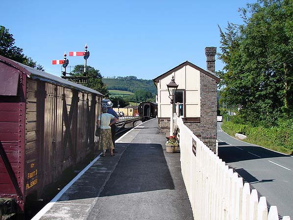 Looking north along the platform at Bronwydd Arms station in August 2005. The new station building is the former signal box from Llandovery.