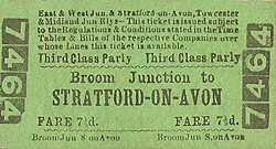 As a passenger station, Broom was not particularly successful: it served a small rural community and was very susceptible to road competition. Passenger services to Stratford were temporarily withdrawn on 16 June 1947 and permanently from 23 May 1949, at which point the station was only seeing two daily workings. Its ghost lingered on in the Barnt Green to Ashchurch timetables until 1962, as the 1pm service from Birmingham New Street to Ashchurch continued to wait at Broom for 20 minutes for a connection which had long ceased (see 1950 Bradshaw below). Goods services between Stratford and Broom continued until 13 June 1960, the freight being diverted via a new south curve at Stratford between the SMJR and Honeybourne line. The Barnt Green line itself closed between Redditch and Evesham from 1 October 1962 due to the unsafe condition of the track; British Railways provided a replacement bus service using hired Midland Red buses, but this was found to be similarly uneconomical and was withdrawn from 17 June 1963.