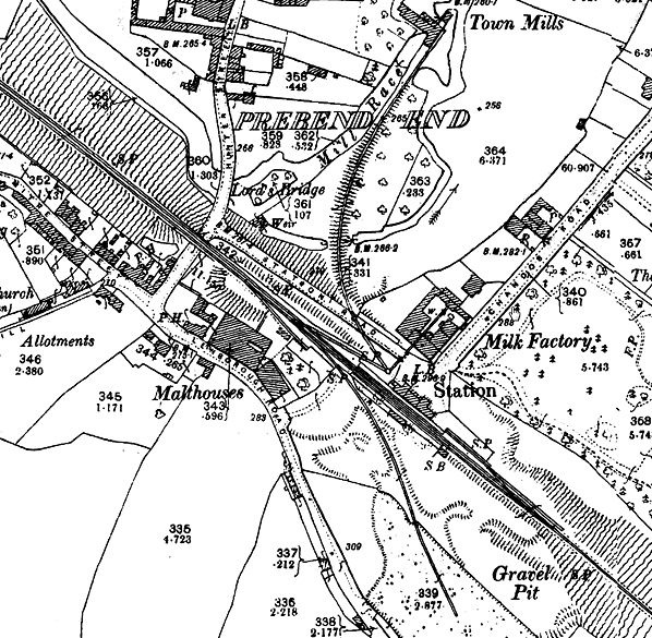![]() ![]() 1900 1:2,500 OS map shows the layout of the station and goods yard. At this time private sidings served a milk factory and the Town Mills on the north side of the station and a gravel pit to and malthouse to the south. By 1922 the two sidings on the north side had been lifted. The gravel pit to the south was disused; the siding was still there but it had been shortened. Only the malthouse siding was still in use.