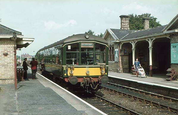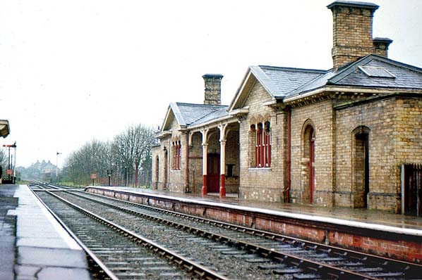Photo from John Mann collection ![]() Buckingham station lookin g north-west from the up platfrorm in March 1962; BR (London Midland Region) maroon signs have now been fitted, including totems. The platforms at Buckingham were never raised and a set of movable wooden steps are seen on the right leaning against the wall.