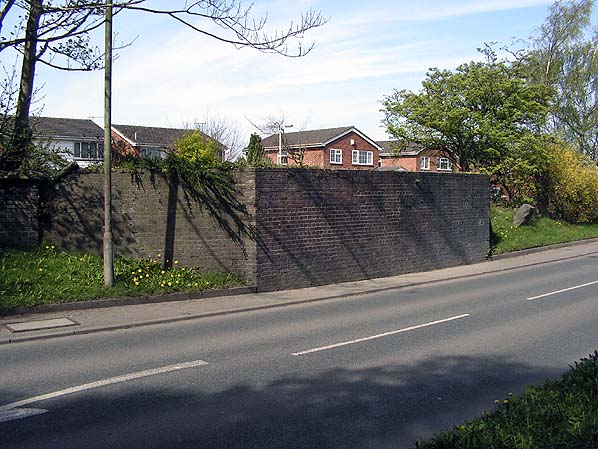 ![]() A section of brickwork from a bridge that once carried the Buckley Railway over the B5127 Ewloe to Buckley Road was all that survived of the line at this location in April 2011. The view is looking north.