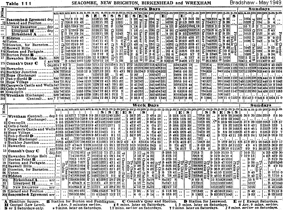 Wrexham Central, Wrexham Exchange, Rhosddu, Hope High Level, Buckley (1st station), Chester Golf Club Halt, Birkenhead Junction Golf Club Platform, Sealand Rifle Range Halt, Storeton,