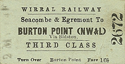 as the MS&LR - they had been from the beginning, and it was involvement in the Bidston line scheme that had bankrupted the WM&CQR. Seacombe was a WR station on the west bank of the Mersey, opposite Liverpool, in the town of Wallasey. A ferry service between Seacombe and Liverpool connected with trains. Through tickets were issued, and timetables stated the arrival and departure times from Liverpool Landing Stage. When the line to Bidston opened there had been hopes of direct working to Liverpool Central Low Level station via the WR to Birkenhead Park and then via the Mersey Railway (MR) under the river to Liverpool. Some excursions had run, but the MR proved uncooperative, and running rights for regular services could not be agreed. By the time Burton Point opened the idea had been dropped. In any event from 1903 the MR was electrified, and no steam workings were permitted.