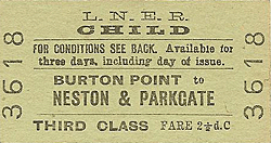 On 1st January 1923 Burton Point became a London & North Eastern Railway (LNER) station. By September 1937 the LNER was running ten trains to Wrexham Central between Monday and Friday, fourteen on Saturdays and three on Sundays. The first Wrexham Central departure was at 8.18am and the last was at 10:10pm Monday to Friday and at 11:39pm on Saturdays. Two trains also ran to Connahs Quay and Shotton between Monday and Saturday. To Seacombe there were thirteen Monday to Friday services and fourteen on Saturdays. The first departure was at 7.27am and the last was at 9.52pm.
