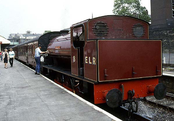 ![]() An Austerity type 0-6-0ST No 8 at Bury Bolton Street station in 1990. The locomotive was painted in a ELR livery. At this time services only operated as far as Ramsbottom. Photo by John Law from his Everything on Rails web site