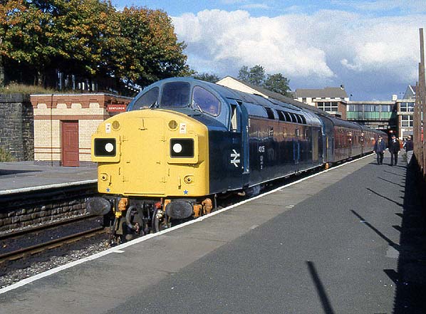 ![]() A heritage train service of the 'new' ELR arives at Bury Bolton Street station's platform 2 in the Autumn of 2004. The train was hauled by a Class 40 Diesel number 40 135. Photo by John Law from his Everything on Rails web site